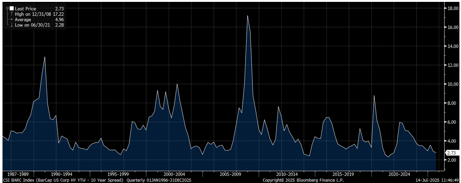High Yield Credit Spreads: Additional yield received above US Treasuries for debt of riskier companies