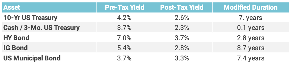 Source: Bloomberg, HY (High Yield ) Bond: LF98TRUU, IG (Investment Grade) Bond: LBUSTRUU, Municipal Bond: LMBITR, respectively. Income Tax Rate Assumptions: Federal (37%), State (10%)