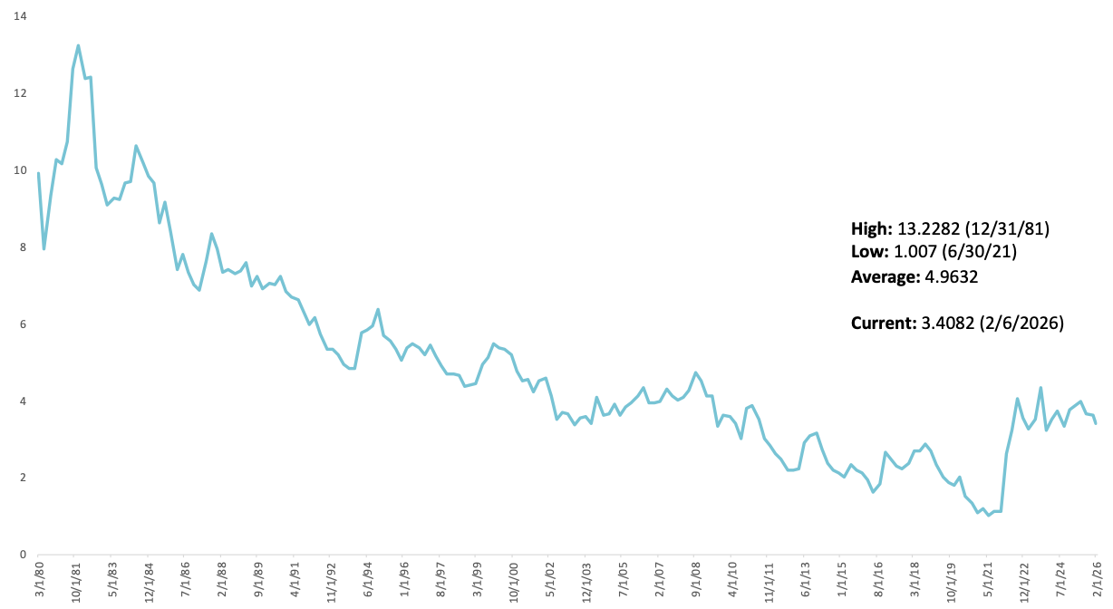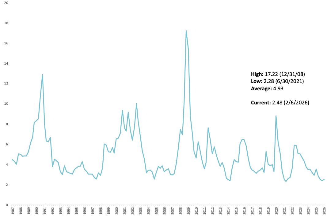The above chart displays a modest credit spread for high-yield bonds issued by companies with riskier balance sheets. We think investing in high-yield bonds will make more sense once credit spreads increase substantially.
