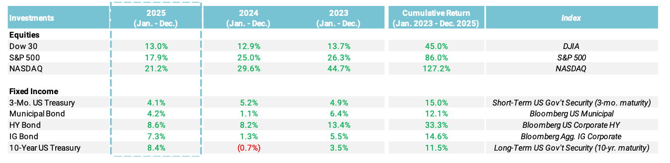 Note: Equity Indices - DJIA, S&P 500, NASDAQ; Fixed Income Indices - SPDR Bloomberg 1-3 Month T-Bill, BBG Municipal Bond Index, BBG US Corporate High Yield, BBG US Agg. Total Return, BBG US Gov.t 10 Year, respectively.