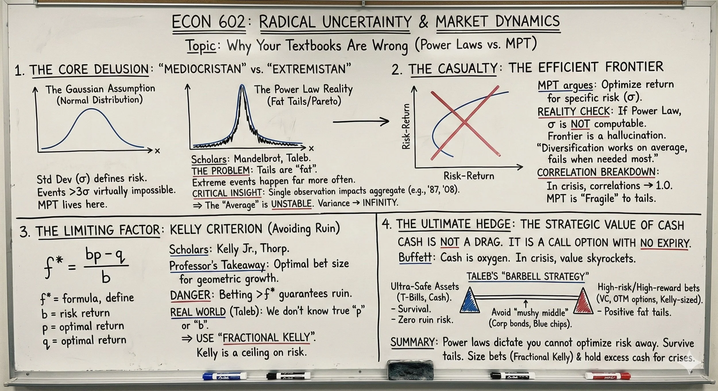 If you took an Econ or Finance 101 class in college, you were likely introduced to a tidy picture of the financial world. You were shown neat bell curves, taught that risk could be measured by historical volatility (standard deviation) and correlations, and introduced to the "Efficient Frontier"—a mathematical promise that you could perfectly optimize your returns for a given level of risk.