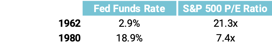Between 1962-1980, the S&P 500 P/E ratio dropped from 21x to 7x, as short-term interest rates skyrocketed from 3% to 19%. This historical trend supports the expectation that earnings yields and long-term bond yields tend to remain in similar ranges over extended periods. Consequently, earning yields should rise as interest rates rise, while P/E ratios decline.